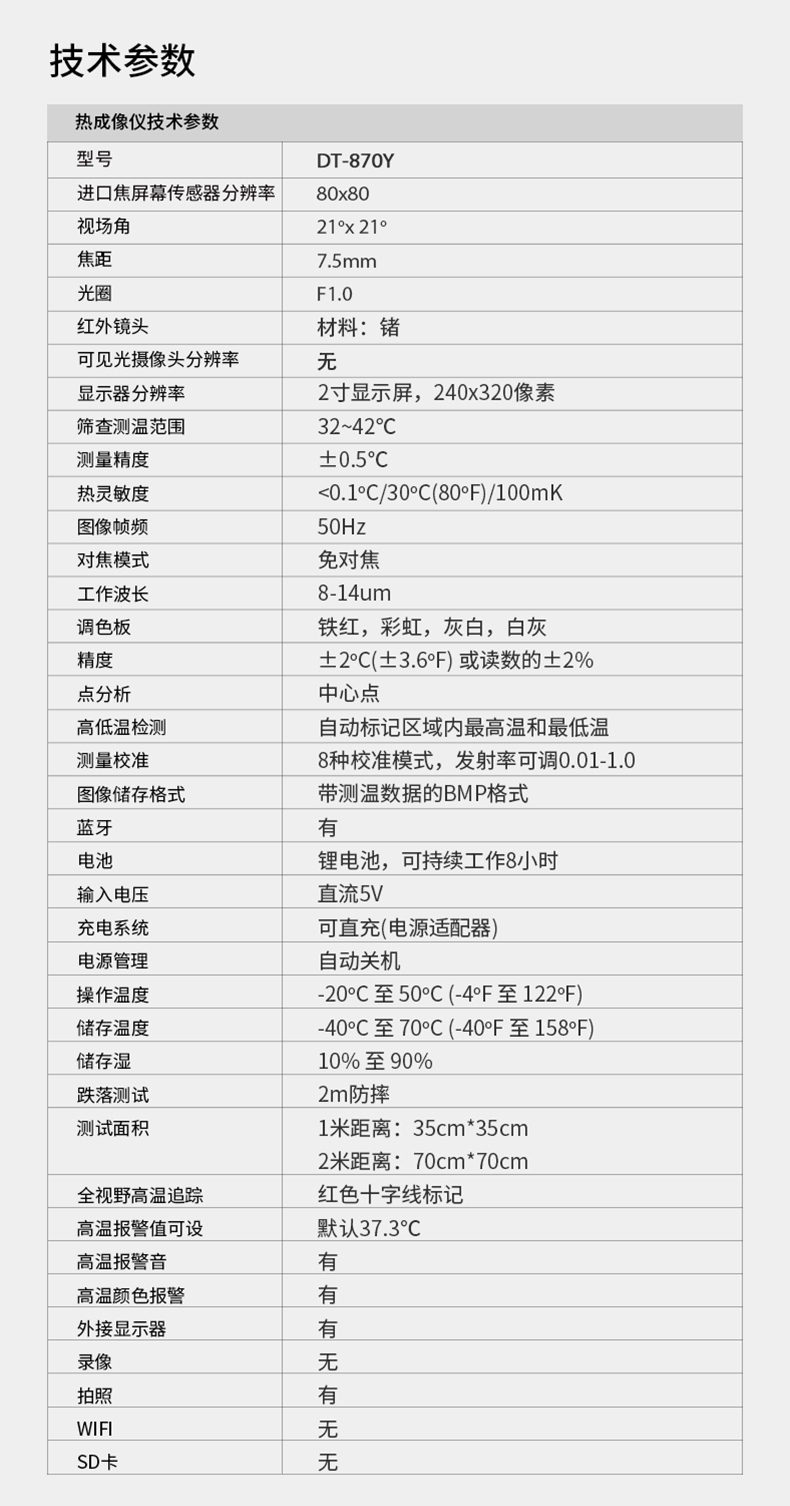 標(biāo)配鏡頭7.5mm,分辨率80×80,IFOV:4.53mard,視場角21×21°,熱靈敏度NETD<0.1℃,圖像幀頻50Hz,溫度范圍(-20-380),可見光分辨率320×240像素