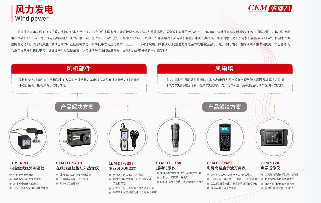 電新增接機(jī)7.6W,海上風(fēng)電斯新增裝機(jī)211G6W。累計裝機(jī)量達(dá)到3375W(較上一年增長12%),其中201年新增海上風(fēng)電較機(jī)容量,中國占據(jù)80%,而中國累計海上風(fēng)電裝機(jī)容最達(dá)7OCSW,將迎來其發(fā)展的高光時刻。浦潔能源生產(chǎn)領(lǐng)域當(dāng)前的產(chǎn)業(yè)應(yīng)用需求是不斷降低平淮化度電成本(LCOE),而對于風(fēng)電,降低LOC的重要方向是保嘀機(jī)組穩(wěn)定運行,減少停機(jī)時間,發(fā)揮其效率和時間優(yōu)勢。華盛昌對風(fēng)力發(fā)電設(shè)備提供包括電氣、機(jī)械維護(hù)以及數(shù)據(jù)采集,狀態(tài)評估等全面的解決方案,保障風(fēng)力發(fā)電設(shè)備的平穩(wěn)高效運行。
