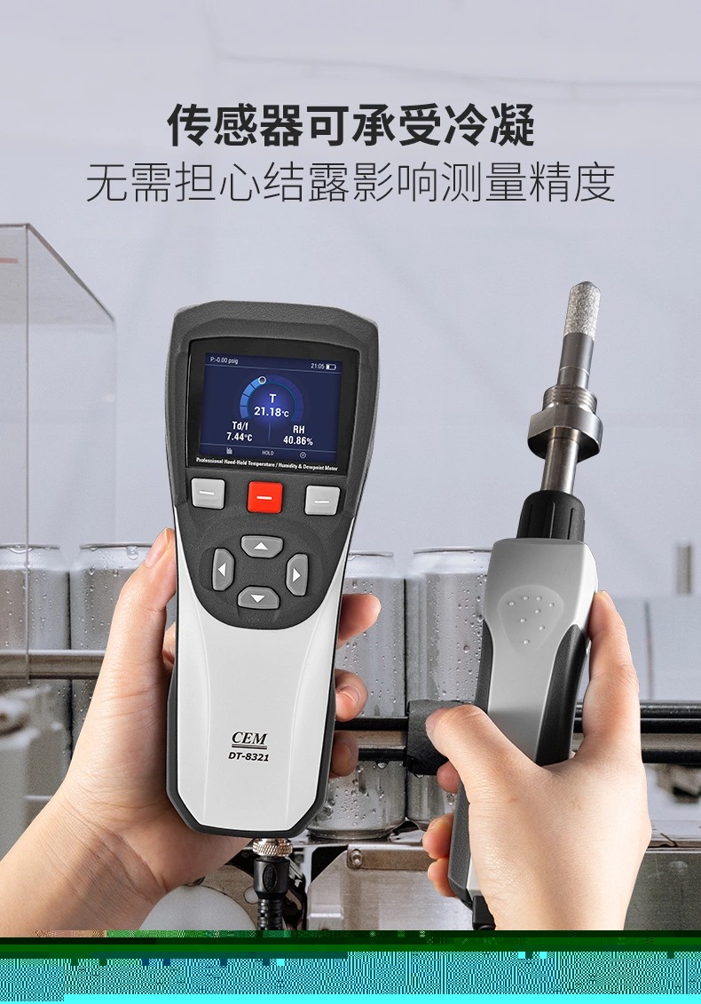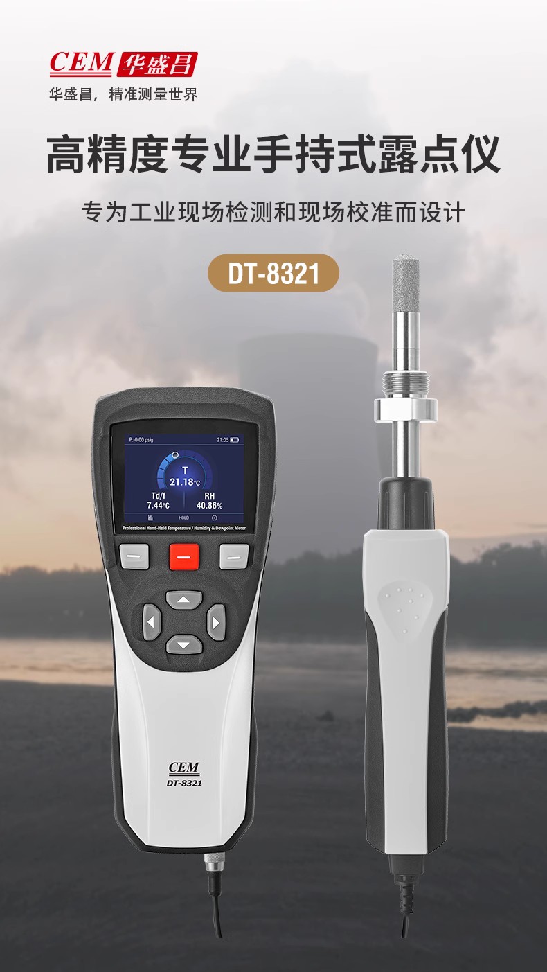CEM DT-8321是CEM華盛昌新設計、研發(fā)和制造的一款高精度專業(yè)手持式露點儀,精度高范圍廣,能在較寬的測量范圍內準確測量露點溫度,探頭可直接插入加壓過程中,并快速響應測試過程環(huán)境條件,為工業(yè)露點測量應用提供準確快速的測量。產品廣泛應用于實驗室、電力電氣、SF6氣體測量、精密制造、化工制藥等領域的大溫度、大壓力范圍內的直接過程露點測量。